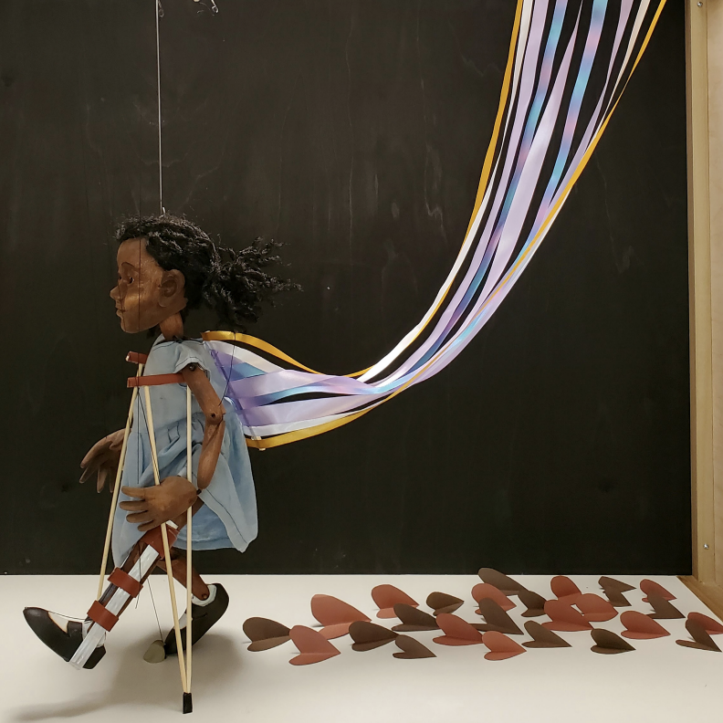 I am inspired by collaboration, community, service. To that end, Remembering Wilma Rudolph was as much about its neighborhood setting as anything else. Wilma’s story unfolded day-by-day for thirty days at the historic Carver Library, the first branch of the Austin library to serve the Black community. Using hand-carved wooden puppets, paintings, quilts, and written and spoken text, the resulting display was a slow storytelling puppet show.