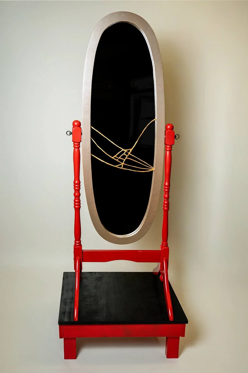 Kintsugi is a traditional Japanese ceramic repair technique that highlights cracks, celebrating the beauty of imperfection and the history of the object. As I was working on the piece, the mirror fell and broke. Kintsugi was the ideal solution; it fit with my feelings of looking at my body in the mirror as I age and struggling with feeling broken when I could be celebrating these changes.